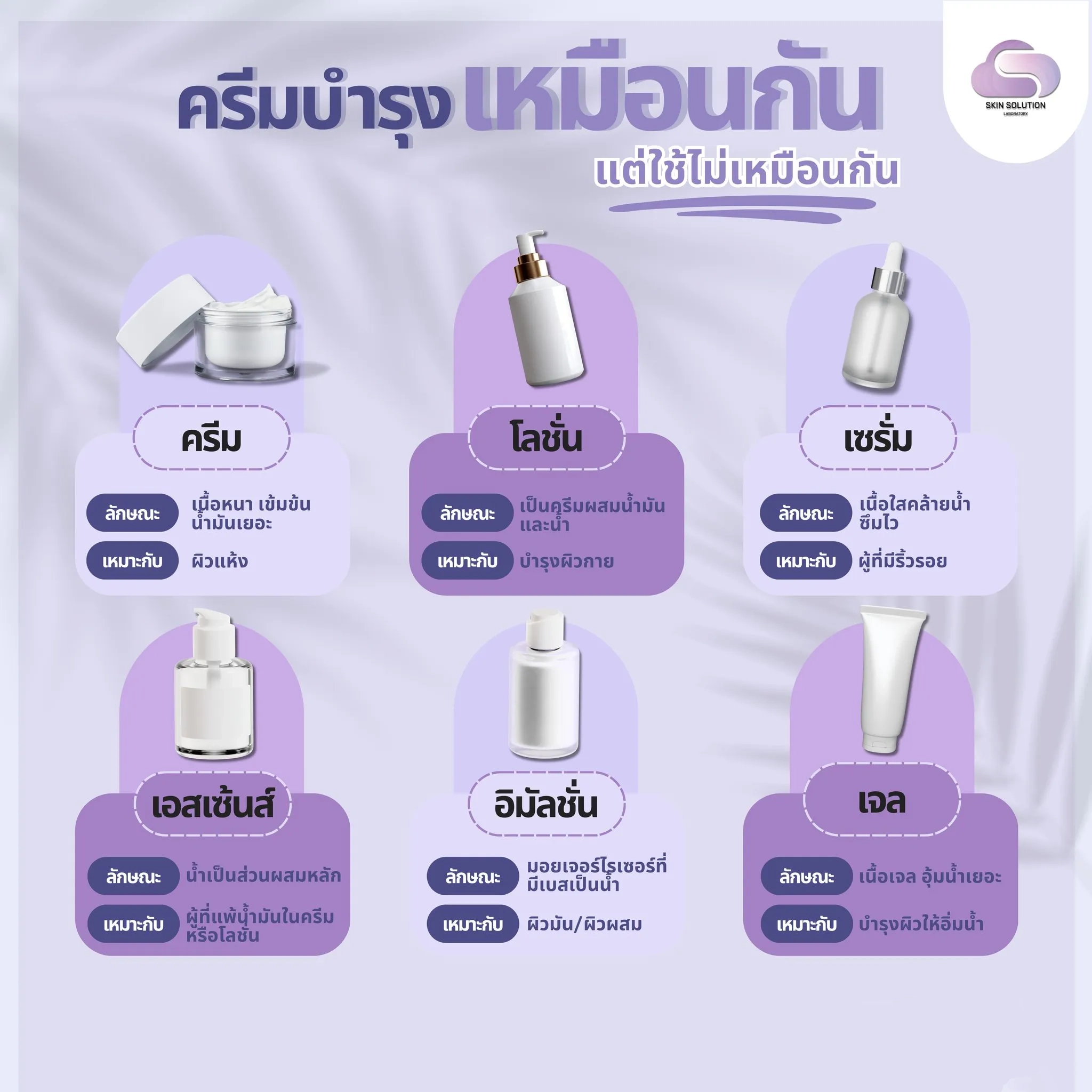 ไม่ว่าจะเป็นเนื้อครีม เจล เซรั่ม โลชั่น เอสเซ้นส์ หรืออีมัลชั่น แต่ละชนิดมีคุณสมบัติและเหมาะกับสภาพผิวที่แตกต่างกัน